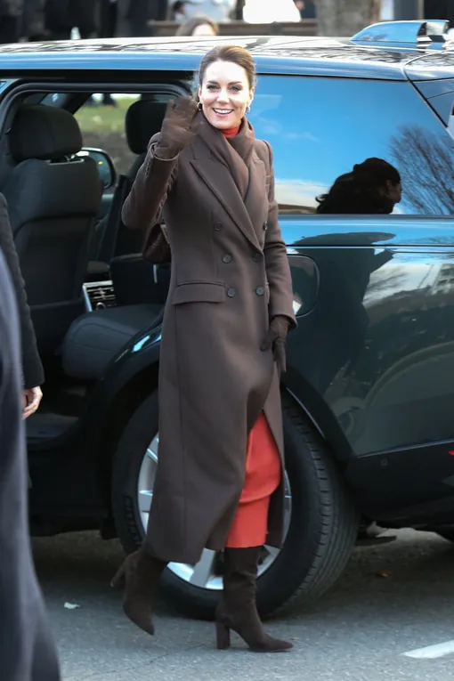 На фото принцесса Кэтрин предстала в сшитом на заказ пальто цвета шоколада от Alexander McQueen, кашемировой водолазке в рубчик и юбке миди оттенка красного осеннего заката Gabriella Heart. Свой образ принцесса дополнила замшевыми сапогами кофейного цвета и перчатками в тон, а также с сумкой в стиле деревенского шика от Lalage Beaumont.
