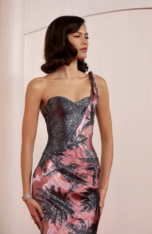 Платье актрисы принадлежит мастерам Armani Privé. Лёгкая ткань в тонах, признанных главными в 2024 году, струится по точеной фигуре девушки. Несколько удачных драпировок уместно расставляют акценты по силуэту. В то же время металлизированный корсаж наряда, выглядывающий из-под этой нежной роскоши, словно бы намекает, что за уязвимой внешностью скрывается сильная личность.
