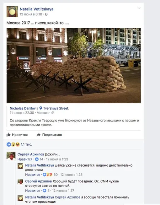«Москва 2017 ... *исец какой-то ...» — написала под публикацией Наталья (орфография и пунктуация автора сохранены. — Прим. ред.). Снимок, размещенный звездой в Сети, сопровождался следующим комментарием: «Со стороны Кремля Тверскую уже блокируют от Навального мешками с песком и противотанковыми ежами». Однако, как позже выяснилось, на фото была запечатлена часть исторической реконструкции под названием «Времена и эпохи», устроенной в честь Дня России 12 июня.