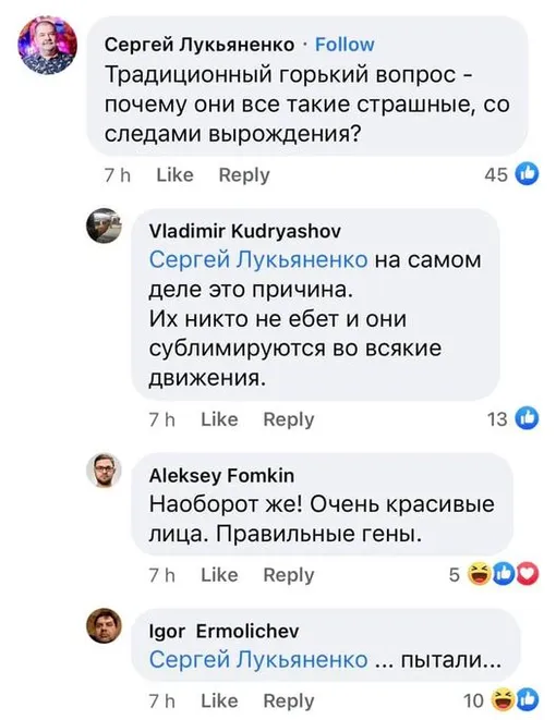 К этим высказываниям присоединился Лукьяненко. «Традиционный горький вопрос — почему они все такие страшные, со следами вырождения», — прокомментировал пост фантаст. К слову, у Сергея от его супруги Софьи, с которой он живет уже 30 лет, есть трое детей — двое сыновей (16 и 12 лет) и семилетняя дочь Надежда.