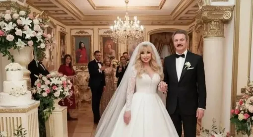 На снимке 61-летняя невеста позировала в эффектном кружевном платье с открытым декольте, подчеркивающим её бюст. Волосы звезда не стала укладывать в причёску, позволив им струиться по плечам. Законченность образу придала длинная фата. Жених для церемонии выбрал классический чёрный костюм с бабочкой и белой рубашкой.