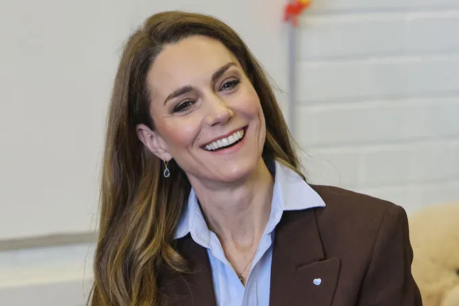 Кейт Миддлтон выбрала для визита шоколадный костюм-двойку с узкими брюками, который дополнила голубой рубашкой от британского бренда WNU с подвернутыми манжетами. В последнее время коричневый цвет стал одним из самых любимых у членов королевской семьи, но именно эта цветовая комбинация была очень популярна на модных подиумах осенью 2026 года, в том числе в моделях Stella McCartney и Prada. Такой ансамбль освежил обычную монохромную палитру принцессы.