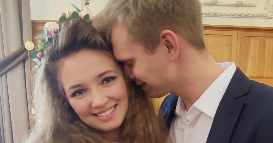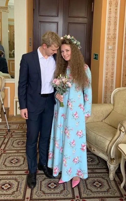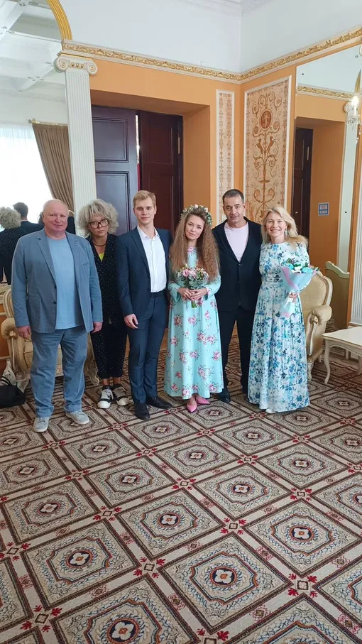 Актёр Дмитрий Певцов в соцсетях опубликовал несколько фотографий из загса. Его приёмная дочь Алёна вышла замуж. Её супругом стал Алексей Тутубалин. Для счастливого дня невеста выбрала необычный наряд: длинное голубое платье в мелкий цветочек, розовые туфли, а голову украсила нежным цветочным венком.