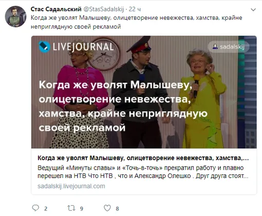 «Ведущий "Минуты славы" и "Точь-в-точь" прекратил работу в 2016 и плавно устроился на НТВ. Что НТВ, что и Александр Олешко. Друг друга стоят. Когда же уволят Малышеву, олицетворение невежества, хамства, крайне неприглядную своей рекламной едой. Жду с нетерпением, а вы?» — с таким посланием и вопросом обратился к своим читателям в «живом журнале» Станислав.