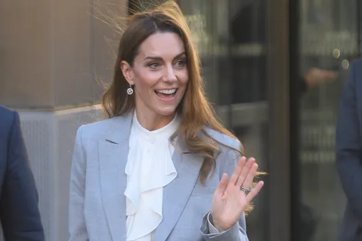 Светло-серый костюм и «кошачий бант»: Кейт Миддлтон совместила в новом образе деловые и романтичные ноты
