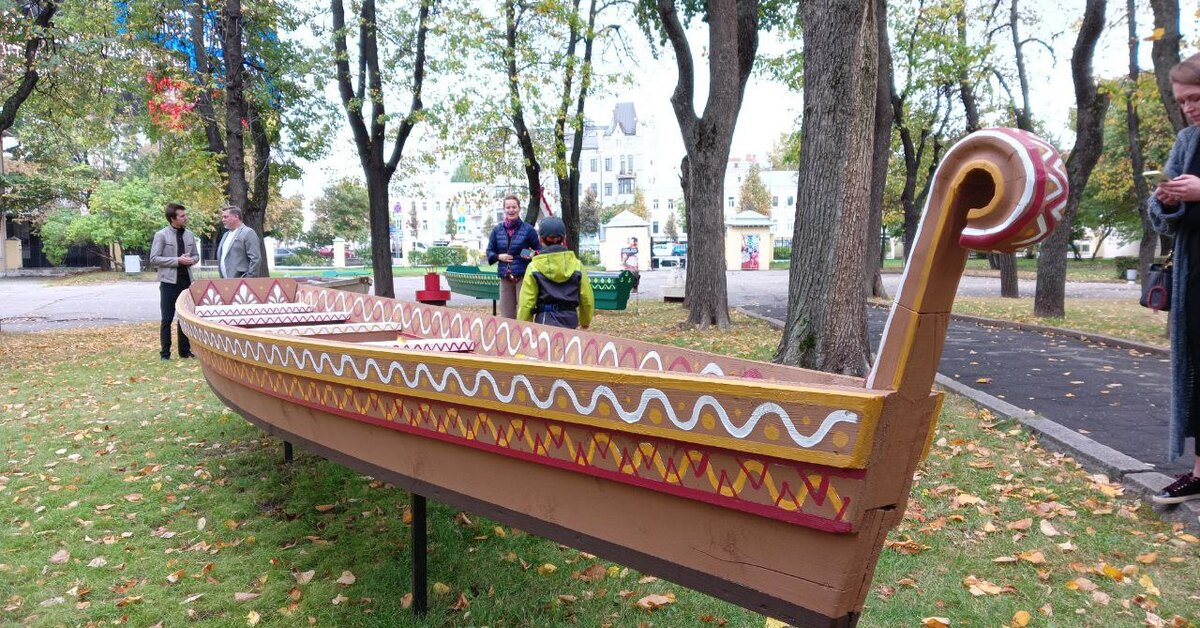 А на днях, уже в Москве, дебютировала другая коллекция Калмыкова, вернее, её небольшая часть. Девять лодок-плоскодонок, расписанных по мотивам традиционной тарусской вышивки, разместились на уличной экспозиции Всероссийского музея декоративного искусства.