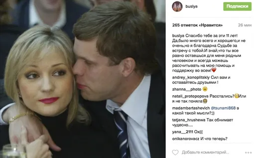 Однако вскоре после этого супруг Татьяны опроверг информацию о разводе с женой, отметив, что в их семье все хорошо. Тем не менее, вчера Буланова вновь сделал заявление, в котором сообщила о расставании с мужем. Певица показала совместное фото с Владиславом, которое сопроводила следующими словами: «Спасибо тебе за эти 11 лет! Да, было много всего и хорошего, и не очень, но я благодарна Судьбе за встречу с тобой. И знай, что ты все равно остаешься для меня родным человеком и всегда можешь рассчитывать на мою помощь и поддержку во всем!» Но вскоре эта запись со страницы Булановой была удалена. А поклонникам лишь остается гадать, что же на самом деле происходит в семье спортсмена и певицы.