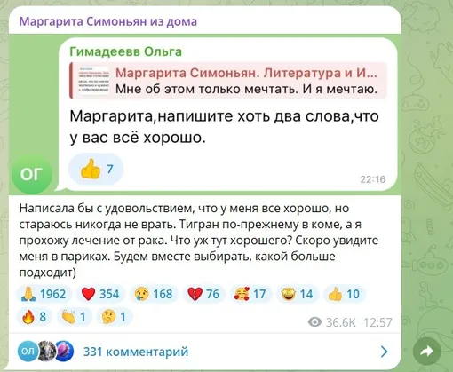 Две недели назад Маргарита Симоньян перенесла операцию по удалению груди. Сейчас у неё идёт реабилитация, однако хирургическое вмешательство не смогло остановить болезнь. Главный редактор государственного телеканала «RT» у себя в соцсети решила откровенно рассказать о своём состоянии.
