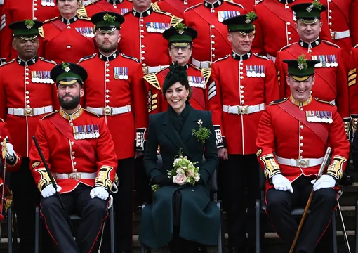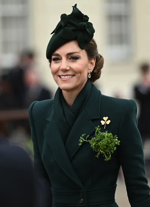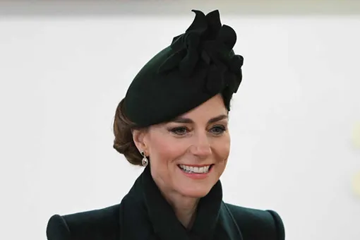 Супруга принца Уильяма Кейт Миддлтон, имеющая почетный титул полковником полка Ирландской гвардии, посетила парад в честь Дня святого Патрика. Для выхода в свет принцесса Уэльская нанесла неброский дневной мейкап с эффектом сияющей кожи, а свои тёмные волосы убрала в изысканную причёску.