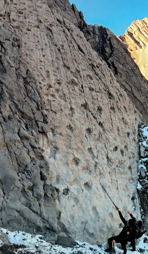 Следы тянутся на сотни метров по скальному склону и образуют параллельные «дорожки». На многих отпечатках хорошо сохранились детали — пальцы и когти, а диаметр отдельных следов достигает 40 сантиметров.