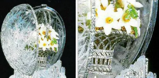 Внутри спрятан сюрприз — маленькая корзиночка, сделанная тоже из платины. Она украшена красивыми розовыми алмазами. Внутри корзинки лежит букет подснежников. Эти цветы сделаны из разных красивых камней: белые лепестки вырезаны из белого кварца, золотые проволочки изображают стебли и тычинки, а листья аккуратно вырезаны из зелёного камня — нефрита.