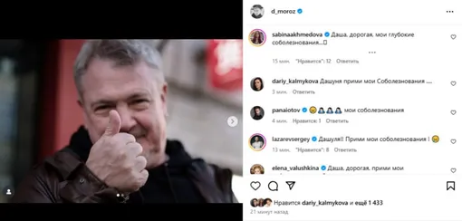 «Даша, всем сердцем соболезную. Он очень-очень хороший и любимый», — пишет Софья Эрнст. «Даша, дорогая, мои глубокие соболезнования», «Дашуля! Прими мои соболезнования!», «Даша, дорогая, прими мои соболезнования», «Сил вам», «Мои соболезнования ... сил Вам», — отреагировали Сабина Ахмедова, Елена Валюшкина, София Каштанова и другие.