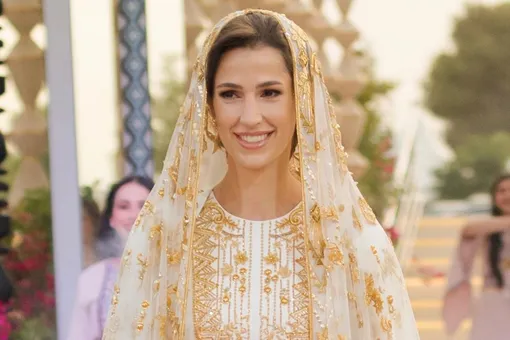 Для мероприятия невестка королевы Рании выбрала платье-миди с цветочным принтом от Paco Rabanne в самом трендовом стиле этого лета — барбикор. Модель стоимостью почти в тысячу долларов поступила в розничную продажу в Moda Operandi — на данный момент доступно ещё два таких наряда. Согласно сайту магазина, дизайнер платья Жюльен Доссена продемонстрировал «чувственную силу контраста». Облегающий силуэт с асимметричным подолом дополняют удлинённые рукава-колокола в стиле парижского шика 80-х. Скромность иорданской принцессы подчёркивает воротник-стойка, дополненный планкой с пуговицами-кристаллами и узким бантом. Если вам нравится стиль принцессы Раджвы, загляните в нашу подборку её знаковых образов — это и арабские платья, и хиты европейской моды.