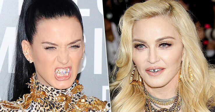 Пример Мадонны тут же подхватила Кэти Перри, надев гриллзы на вручение наград MTV. Украшение певицы покрывало все зубы и светилось разными цветами инкрустированных бриллиантов. Говорят, это украшение стоило миллион долларов и было заказано у знаменитого голливудского ювелира Пола Уолла. В сочетании с леопардовым платьем и соответствующим оскалом Кэти (гриллзы, в конце концов, нужно демонстрировать, иначе какой смысл?) вид был весьма и весьма провокационным. Видимо, Кэти полюбилось это украшение, и для клипа на песню Dark Horse она также выбрала аксессуаром гриллзы. Здесь она появилась в образе Клеопатры, а на зубах у нее были огромные камни.